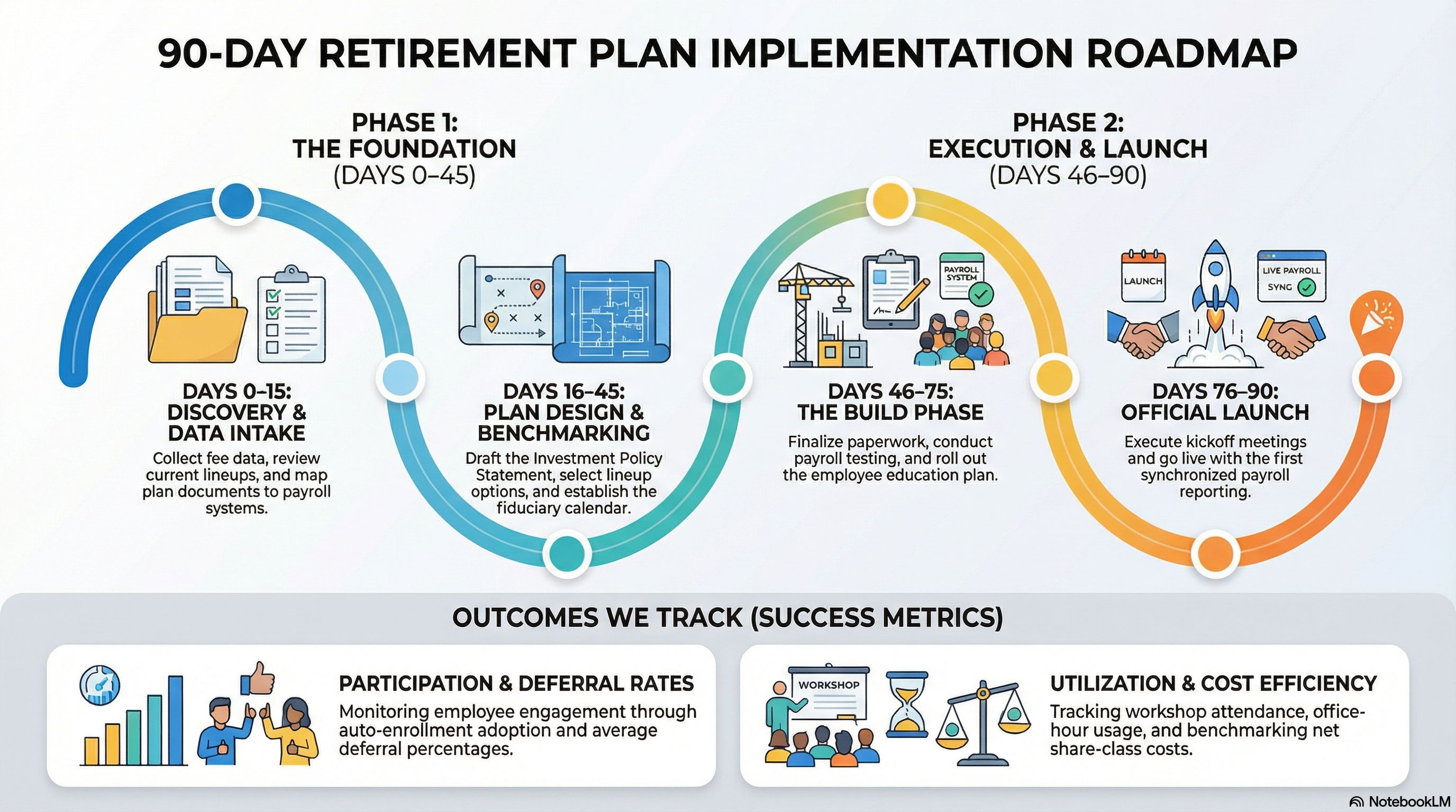 Workshops, office hours, and targeted communications aligned to plan milestones. We track participation, deferrals, and engagement and review results with your committee.